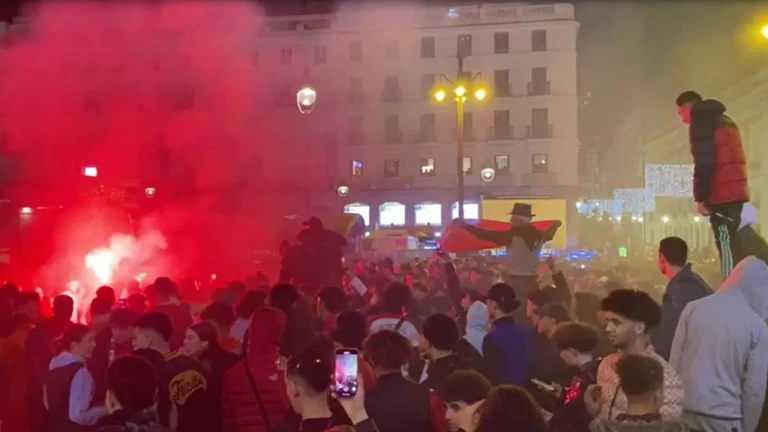 'La Linterna' de COPE ha salido a la calle para contar la celebración eufórica de la población marroquí de nuestro país, la cual se ha desarrollado con normalidad en la capital, sin lamentar altercados. Hay cánticos y celebración, mientras se encienden algunas bengalas.