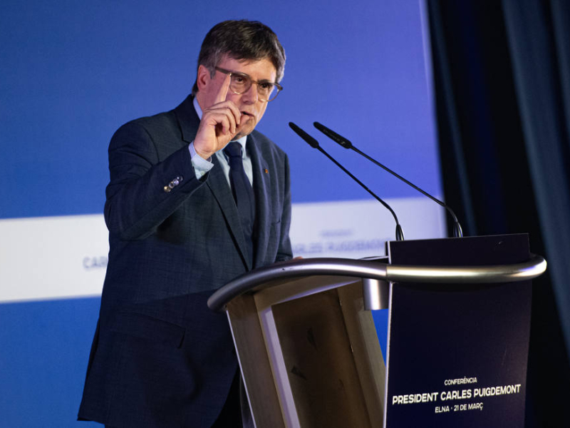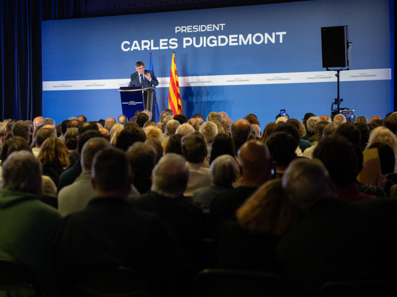 El expresidente de la Generalitat y eurodiputado de Junts, Carles Puigdemont, durante una conferencia, en Mairie d'Elne (Ayuntamiento de Elna)