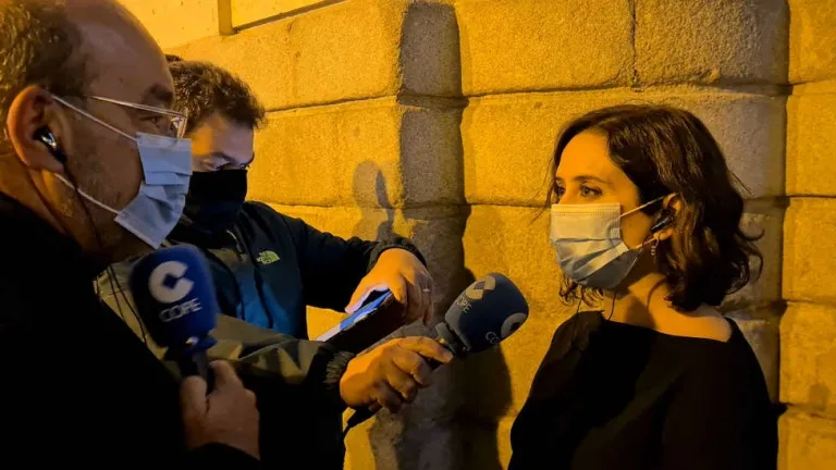 A las 10 de la noche, a la vez que entraban en vigor las restricciones, Ángel Expósito hacia radio en directo en la Puerta del Sol. Con él estaba la presidenta madrileña, Isabel Díaz Ayuso quien cargaba contra el Gobierno de Sánchez, venía a decir que la ayuda ha llegado tarde y mal.