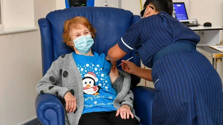 Se llama Margaret Keenan, todo el mundo le llama Maggie y está a punto de cumplir 91 años. Su aspecto apunta a que podría tener menos años, pero, no, tiene 90. Esta mañana, a primerísima hora, antes de las 7 de la mañana, ha acudido al Hospital Universitario de Coventry, que está en el centro de Inglaterra. Su chaqueta gris, con lunares del mismo color, ha pasado inadvertida. Pero no su camiseta. Era de manga corta, pero guardando la estética del clásico jumper navideño en el que se leía Feliz Navidad. Allí en ese hospital, Maggie se ha convertido en la primera británica en ponerse la vacuna de Pfizer y cuando le han inyectado la primera dosis, el personal sanitario que la rodeaba ha roto en un aplauso.