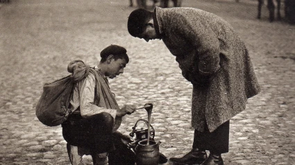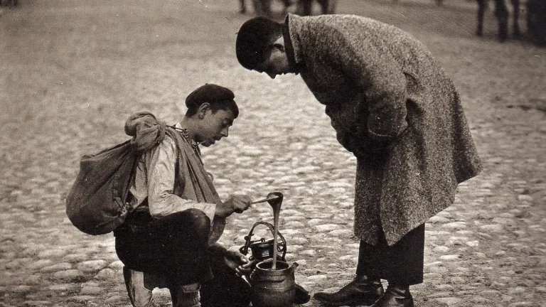 La foto que me ha llamado la atención hoy es de Alfonsito, de Alfonso, el hombre que retrató España al principios del siglo XX. Hay una exposición de Alfonso en Madrid. La imagen está tomada en la calle de una ciudad en la que los pocos coches que circulan están tirados por caballos o mulos. En medio de un empedrado con cantos grandes y poco pulidos, empedrado que hace de calzada, dos hombres se han detenido. Uno de ellos lleva botines negros, un abrigo grande de mezcla. Se agacha hacia el otro joven que calza unas alpargatas rusticas y una camisa blanca. Es el mielero. Las alpargatas y la camisa las trae manchadas de trajinar en el campo. El mielero gasta una boina pequeña y lleva sobre los hombros dos alforjas. Huele el mielero al humo de su casa pobre, a las horas del largo camino. Se inclina el mielero sobre dos orzas de barro. Para enseñar su mercancía ha metido una cuchara de palo en una de las ollas y ha levantado el almíbar. Los dos jóvenes, en una mañana fría, miran el chorro de oro dulce que parece casi sólido. La gota de miel cae como un beso largo, como una cascada de dulzura largamente esperada. Adustos y ásperos los jóvenes, uno con la piel toda arañada por las zarzas del campo, por las soledades -la lucha por el pan no deja descanso- el otro con los ojos llenos ya del desencanto, de la prisa y de la falta de inocencia de la ciudad, adustos y ásperos los jóvenes se quedan prendados de la luz dulce que huele a flor de tomillo y de romero. La miel cae despacio y despierta en la mañana fría de una calle inhóspita, en los ojos adustos y ásperos de dos jóvenes, el deseo de una ternura lenta.
