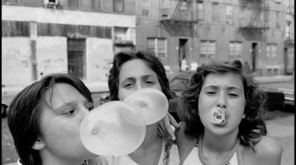 La foto que me ha llamado la atención la he visto hoy trasteando en internet. Es de una fotógrafa estadounidense, Susan Miselas. Debió hacerla en los años 70. Es una foto urbana. En un callejón de un barrio pobre, tres niñas, ya mayores, pero todavía niñas, inflan sus pompas de chicle. De fondo la fachada trasera de unas viviendas modestas, con escaleras de incendios como las de la Ventana Indiscreta de Hitchcock. La primera niña tiene el pelo cortada a capas, la cara redonda, los ojos entornados, casi cerrados para concentrarse mejor. Sopla mucho pero sin resultado. Las otras dos sí han conseguido una gran pompa cada una. Están a punto de estallar y la goma de mascar se les va a convertir en unos segundos en un churrete pegajoso. Niñas en una calle sin alcorques, sin árboles y sin flores. Niñas contentas jugando con un chicle y con el aire, niñas que no conocen el olor del estiércol, el sonido del arroyo, el rayo en la encina. Les da igual. Las escaleras de hierro, un coche abandonado, los charcos, el gato que persiguen, las conversaciones apasionadas llenas de aventuras por llegar les sobran y les bastan. Todo es suyo en el callejón, tienen todo: un padre y una madre en casa, un maestro en la escuela, se tienen a sí mismas y las mañanas, las tardes, las noches, viven el tiempo como un regalo y no como un robo. Crecerán las tres niñas del chicle y todo será a partir de ese momento un esforzado viaje para volver a mirar todo como lo veían en su callejón. En su comienzo está su final.