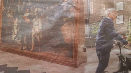 La foto que me ha llamado la atención la publica hoy la Vanguardia. La instantánea está tomada en una residencia de ancianos en Amsterdam. En el patio de la residencia han instalado una reproducción a tamaño natural de La ronda de noche del señor Rembrant, un cuadro en el que algunos compadres con aspecto de mosqueteros y sombreros muy grandes recorren las calles de la ciudad . La copia está muy bien hecha y se ve a un elegante caballero vestido de amarillo con faja blanca, pica en mano, conversaranimadamente con otro que parece apoyarse en una lanza corta. Y otro, vestido de colorado y con gárgola, ceba un gran mosquetón. Y dos más allá lucen sus cascos en los que se refleja una luz misteriosa. Y en la otra esquina un holandés bajito toca un gran tambor. Y todo es bullicio, estandartes, ruido, rostros, conversaciones. Estruendo, colores deliciosos, retratos de aguerridos miembros de una milicia dispuestos a todo, sobre todo a vivir. Junto a la reproducción del cuadro, en la residencia camina uno de sus alojados, un anciano que se apoya en un andador con un pequeño motorcito. El anciano calza unas chanclas de piscina y viste sus pies con calcetines blancos. Cada paso es un hazaña. Dialogan las dos estampas, la de la ronda de noche, atropellada, derrochando energía, y la del viejo que avanza lento, pies y pensamiento a ritmo calmado. Pero no está dicho, no está dicho que haya más vida en la ronda de noche que en el paseo del anciano. Al viejo le han vestido, porque ya no le dan las fuerzas para arreglarse el solo, y cuando ha dado el primer paso ha visto un rayo de luz colándose por la ventana entornada y ese rayo de luz le ha llenado de alegría, de agradecimiento, sus piernas y sus brazos torpes se han visto sacudidos por una gratitud inmensa, la vida le ha vuelto a visitar. Quizás ninguno de los señores de la ronda de noche ha estado tan lúcido.