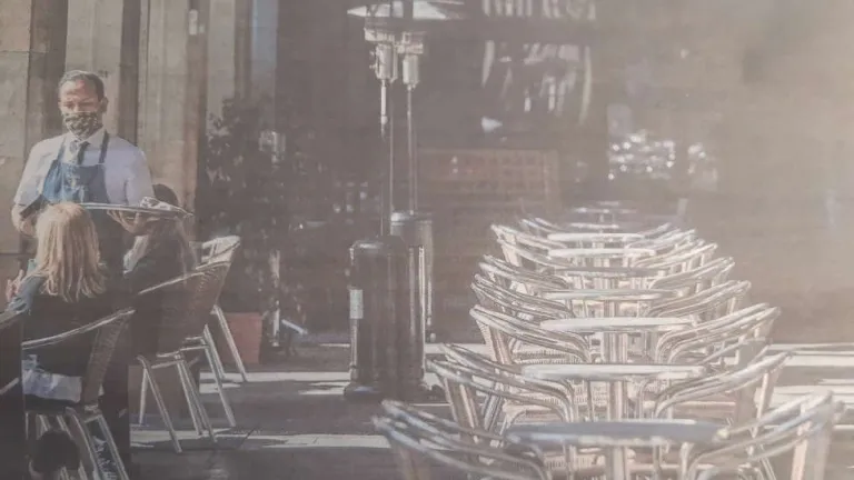La foto que me ha llamado la atención la publica hoy La Vanguardia. Está tomada en Barcelona en una terraza instalada en unos soportales. La luz de la primera hora de la tarde, luz que viene bañada en sal y mar, parece querer iluminar el secreto de las cosas, sacar su belleza oculta. Cae esa luz sobre una larga fila de mesas de metal que están todas vacías. Nadie se sienta en las sillas que las acompañan a las mesas. Están solas. A la izquierda de la escena un señor camarero con corbata, delantal y mascarilla se entretiene hablando con una señora rubia que ha salido a tomar un café acompañada de su perro. La luz bañada en sal y mar ilumina la frente del camarero y la cabeza de la señora que explica algo importante juntando las manos. El señor camarero tomó nota del tipo de café que pedía la señora, se lo trajo y ahora la oye con atención. En tiempos, en cada una de las sillas, hubo sentadas otras señores y señores que cada uno pedía lo suyo: unos torreznos y un vino con gaseosa, un gin con burbujas, un agua con agujeritos. El camarero los escuchaba con atención. Las señoras y los señores lo sabían, sabían que estaban siendo escuchados y atendidos y pedían sus torreznos como quien implora felicidad para los hijos, pedían vino con gaseosa como quien pide un amor muy grande que dure para siempre, pedían gin con burbujas como quien pide una canción napolitana que saque de dentro toda la nostalgia, pedían, en fin, pedían agua con agujeritos como quien suplica un beso. Y el señor camarero tomaba nota. Porque de toda petición hay que tomar nota.
