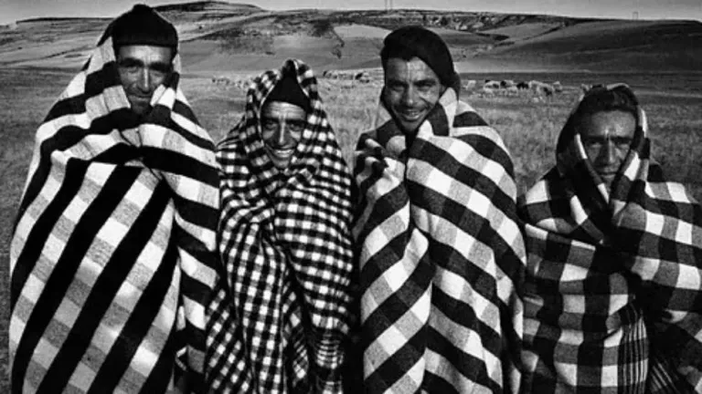 La foto que me ha llamado hoy la atención es de Masats, Ramón Masats, el hombre que retrató en blanco y negro la España de los 50 y de los 60. En Masats, del que ahora hay una exposición en Tabacalera, es más fuerte la mirada que los postulados. La foto que me ha llamado la atención retrata a cuatro pastores, cuatro pastores envueltos en grandes mantas de cuadros con la que se cubren hasta la cabeza. Intentan ahuyentar el frío que no ha matado una hoguera mortecina de mala leña, el frío de estar semanas fuera de casa, el frío que da roer mendrugos con poco queso. El más menudo parece tiritar. De fondo se ven unos alcores castellanos, alcores pelados de la meseta, alcores de una tierra dura, ingrata y pobre, sin sombra a la que acogerse. Más cerca, un campo de trigo ralo y seco. Y aunque no se vean en la foto, se oyen las esquilas de las merinas, suenan los cencerros convocado a unas vísperas a las que no acude ni el viento. Tienen los cuatro pastores la piel curtida como si llevasen siglos segando. Pero lo primero y lo último que se mira en esta foto de los años 50 es la sonrisa de los pastores, a uno hasta se le ven los dientes, los tiene todos. Son cuatro sonrisas que parecen de niños, sonrisa de niños en caras de hombres. Sonrisa amanecida después de haberse reencontrado, cada uno andaba por su lado buscando pasturas. Se han dicho pocas palabras al volverse a ver, porque a los cuatro pastores el silencio se les ha convertido en costumbre, en hábito que llevan por dentro. Pero al verse les ha amanecido una sonrisa de niños. Solos parecían, pero solos no estaban.