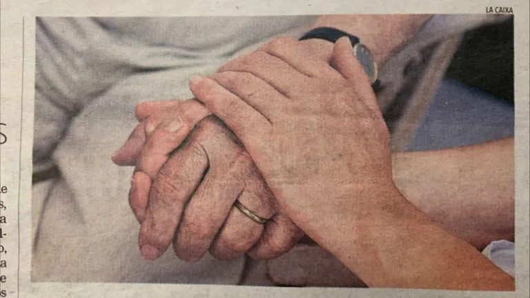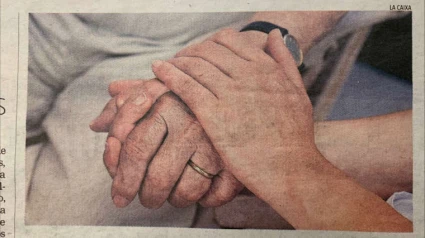 En este caso, en el centro de la foto está la mano de un anciano. La mano de un hombre casado, de dedos cuidados, de nudillos sufridos y uñas bien recortadas. Esta mano, ligeramente hinchadas, se deja sostener por otros dos manos mucho más jóvenes. Dice mucho del hombre retratado este dejarse sostener, acompañar, acariciar por unas manos jóvenes. La manos jóvenes tienen impetu, pasión, afecto. A las manos jóvenes no les basta con sostener la mano del hombre mayor. Las manos del joven hacen un nido, sostienen, tapan, aprietan las manos del hombre mayor.