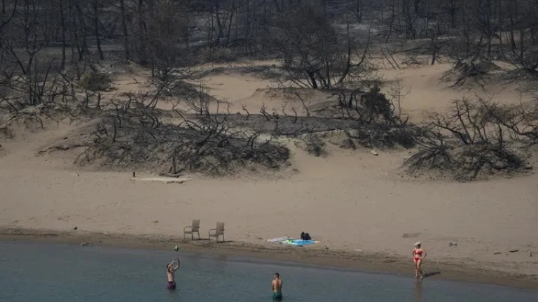 La foto de hoy llega de una extraña playa. Es una playa de arena con pinos, con mirto y con jaras que llegan casi hasta el agua. Casi llegaban. Porque ahora los arboles, las matas que no hicieron tronco, las hierbas..todo está negro y retorcido. Las llamas y luego las brasas han convertido el monte en carbón. Islas de carbón entre la arena, en pie los palos oscuros como balizas de una desesperación. Huele a quemado, a derrota, quién sabe si a muerte. En la orilla una chica con un biquini rojo. Tiene las manos en jarras y va a meterse en el mar, un mar de riquezas y piedades. Dos chicos crecidos, con el mar hasta la cintura juegan a lanzarse una pelota. Han puesto dos sillas donde la arena deja de estar mojada. No son dos sillas de bañista, son dos sillones de madera y paja, con el respaldo muy recto y buenos reposabrazos. Son dos sillas para que los que se sienten en ellas ejerzan de soberanos, para que muestren su dominio, para que alargando y estirando la mirada hagan uso de su título de propiedad sobre el horizonte. Dos sillas como dos tronos regios con los restos del incendio a las espaldas y por delante ínsulas, travesías, vientos, galernas, levantes y ponientes, por delante el confín sin confines, la vuelta a casa donde espera el perro fiel y la mujer que teje, por delante la vida por descubrir, la vida ya alcanzada, la vida por navegar.