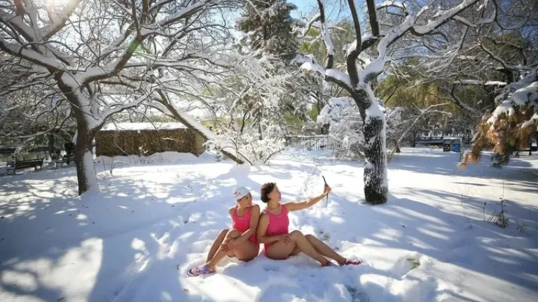 Foto de dos señoras chinas entusiasmadas, radiantes. La mañana está luminosa como si fuera una mañana de enero. El parque más conocido de la ciudad de Shenyang, al norte del país, ha amanecido nevado. El sol juguetea con las ramas desnudas de los árboles, y es atronador ese silencio que acompaña un buen nevazo. Y nadie ha pisado lo blanco y parece que el mundo está en orden. Las dos señoras han salido de casa con un traje de baño rosa, rosa chicle, debajo del abrigo. Al llegar al parque han roto el hielo de una laguna detenida por el frío y han hecho la heroicidad de sumergirse en sus aguas infernalmente gélidas. Y ahora, sentadas en el suelo, a la sombra de un tronco con los brazos muy abiertos, se hacen un selfi. A la primera señora no le se encoge ni un músculo, solo levanta el teléfono y posa con mucha intención. A la segunda si se la ve algo rígida. Se agarra las piernas y se vuelve deseosa de quedar inmortalizada. Las dos señoras disfrutan del calor que les da haber hecho lo que nadie hace, paladean la dulzura que les da el triunfo de su voluntad, el arrojo que han tenido para desafiar la helada. Se han convencido de que no era para tanto, de que lo malo ha sido la primera impresión, de que si eran capaces de aguantar los primeros minutos todo sería más fácil. Se han convencido de que el secreto es no molestar el alma con las cosas que no se pueden controlar, se han convencido de que el secreto es dejar de desear el calor, vivir, en definitiva, sin pretensiones. Pero los primeros síntomas de congelación ha empezado a aparecer.