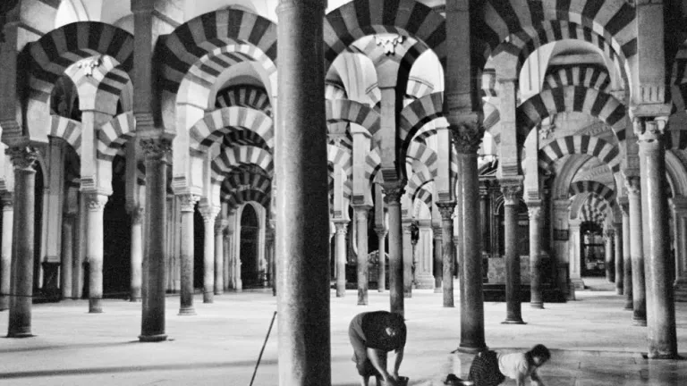 Foto de Fernando de Haro: “Las dos mujeres friegan el suelo de un bosque de columnas..."