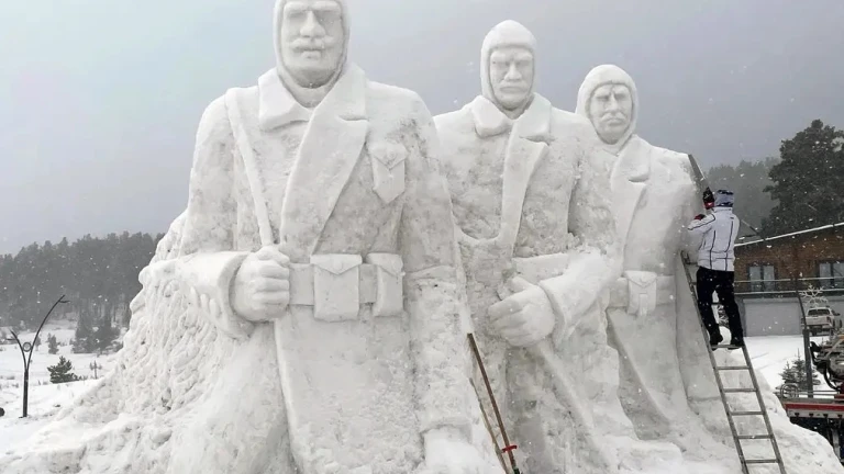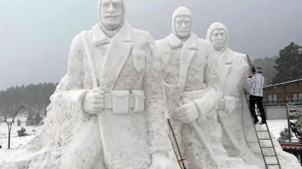 Foto de un rincón del mundo en el que ha nevado mucho : la nieve, silenciosa, sigue cayendo. Un cielo entre blanco y gris desteje sin hacer ruido trapos ligeros de sal y nardo. Los arboles apelotonados y delgados de un bosquecillo no consiguen retener los restos del nevazo que se esconden entre los troncos. Un vecino con las orejas tapadas trabaja en una gran escultura de hielo sucio. Primero ha formado una pequeña montaña y después ha cincelado con una sierra tres grandes soldados gigantes, con la altura de tres hombres y la anchura de un elefante. Los soldados de nieve visten grandes abrigos secos y se ciñen con las cartucheras reglamentarias del ejército otomano. Los tres se cubren la cabeza con un verdugo, a los tres les ha florecido un gran mostacho bajo las narices. El primero mira al frente, el segundo mira a Levante y el tercero levanta la vista para dejársela enganchada en un horizonte lejano. Las tres figuras, de gran bulto, se han dado un baño de un mármol que quedará en nada tan pronto como salga el sol, salga para no esconderse. Las tres figuras, bien compuestas, solemnes, son pasajeras como un suspiro veloz, como un merengue, como un destello de una luz de ambulancia sin sonido. Los tres soldados son convidados de nieve que recuerdan la batalla que perdieron, la batalla contra el tiempo en la que fueron derrotados. Desde aquella vieja ruina los convidados de hielo reaparecen todos los inviernos para reclutar suspiros y destellos efímeros.