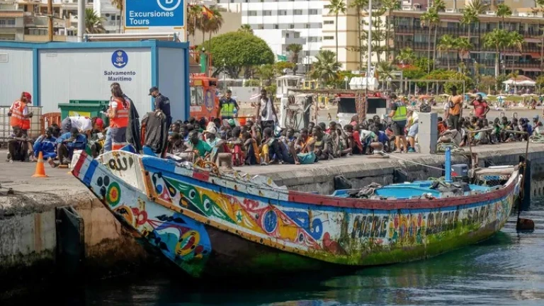 La foto de hoy está tomada en Tenerife, en el puerto de los Cristianos. De fondo bloques de apartamentos y palmeras con barbas. Luego los muelles y el agua cansada, sucia, asilo contra tempestades, defensa de los vientos. Detrás de los atraques, una larga formación de hombres negros sentados en el suelo. Están sentados en ocho filas, están al sol. Muy pocos llevan gorra, uno de ellos conserva una bolsa de deporte, el resto ha viajado o ha llegado con lo puesto: pantalones de colores, camisetas de imitación y mucha ansia por encontrar un mundo ameno, apacible, con trabajo, donde no se desfallezca de hambre, de miedo, donde las armas tengan fundas y se usen poco. Un par de policías les piden la documentación que no tienen y dos voluntarios de Cruz Roja miran a ver si los viajeros necesitan algún remedio o alguna cura urgente. Los navegantes necesitan descanso y esperanza. Junto a ellos, en el muelle, hay atracados dos lanchones estrechos y muy largos. Los lanchones, los cayucos, con los cascos muy alegres. Sobre el blanco de fondo se asoman colores alegres, azules que sobraron cuando se pintó el mundo, verdes con porvenir, amarillos y rojos de un fuego inagotable. Los colores, con júbilo y contento, dibujan formas y animales traviesos. Los colores del cayuco lucen como un milagro que desafía al agua del puerto, al cielo de la isla. Los colores del cayuco son insólitos, atrevidos como si no hubiese nada más que el ansia de vivir.