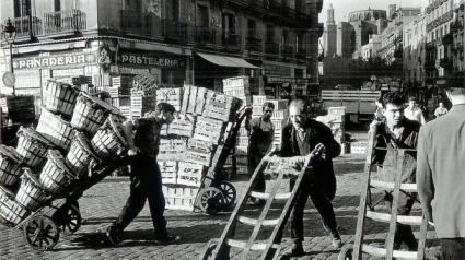 Foto del gran Joan Colom. Foto histórica, en blanco y negro, de una calle con adoquines, de la esquina grande de una calle con una panadería, con una casa con balcones estrechos, con una iglesia que vuela sobre arbotantes sólidos, una calle con mucho ajetreo, los mozos de las fruterías y de los colmados van y vienen con carretillas de mano, carretillas con ruedas y armazones de madera, cartillas que de pie llegan al cuello. Uno de los mozos tiene la carretilla cargada hasta arriba con grades cestos tapados con primor, será para que no escapen las acelgas o las alcachofas. Otro joven con la carretilla desborda con cajas de naranja se ha detenido a descansar. Los mozos que llevan las carretillas llenas tienen cara de cansados, de esforzados, como si estuvieran al límite de sus energías. Los mozos que llevan las carretillas vacías tienen cara de angustia, como si hubieran sacado a pasear su desconsuelo, su apuro porque al final del día no tendrán jornal. Unos mozos llevan delantal, otros chaleco o chaqueta y las ropas de unos y otros lucen resobadas, brillan de gastadas que están. Son ropas que huelen a humedad vieja, a potaje con mucha berza y poco tocino, con mucho repollo y poco carnero. Ropas de mozos solos que no buscan la alegría en los confites sino en una tarde de sol, en un cuartillo de vino bebido con los compañeros, en domingos de mucho paseo y poco gasto. Mozos pobres de cuartos y ricos en deseos y en felicidades que están por llegar.