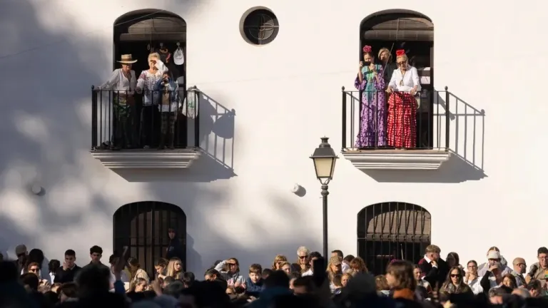 La foto es la foto de una fachada vestida de blanco, vestida con primor, lisa, una fachada hospitalaria con la primera luz de la mañana. Se le asoman dos balcones y en medio un ojo de buey. Los balcones, simétricos, con barandales de hierro forjado que pintan una sombra muy elegante, con persianas de esparto oscuro que se enrollan con una cuerda y que pesan mucho. En la fachada balcones y en el patio un jazmín y un galán de noche y unas varas de nardo y también rosas blancas. Y en los balcones gentes de marisma y de sal, de botas para el barro, jinetes de mula mora. Los árboles de la calle, pinos altos, dan sombra a un caballista con sombrero de ala ancha. Los demás, las mujeres con clavel en la oreja y falda rociera, los vecinos que se orillan en la acera, los turistas, los devotos, los curiosos se echan una mano a la frente para usarla como una visera o sacan las gafas de sol de la chaqueta. La gente de los balcones, la que está plantada en la calle, el jazmín y el galán de noche están aguardando, esperan que llegue alguien, que pase algo. Le dan tiempo a la espera. Aguardar es esperar a cobrar algo que te deben. Alguien no nos ha pagado una deuda y tenemos un letra de cambio o un pagaré o un cheque y hacemos tiempo para que el deudor se ponga al día. Nos subimos a los balcones de fachadas como la nieve, arreglamos el jazmín, usamos la mano como una visera porque en algún cajón , en algún bolsillo, en las entrecarnes llevamos escondido un recibo pendiente. Aguardamos que pase algo, que pase alguién, que nos salden lo que nos han prometido.