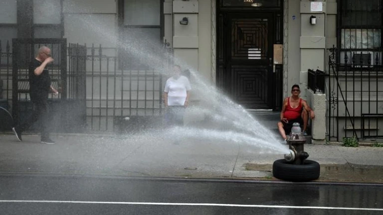 La foto de hoy está tomada en una de esas calles en las que nunca hemos estado, una de esas calles que solo conocemos por las películas. Una calle de Nueva York con casas adosadas, con rejas para que nadie se cuele en los semisotanos que en un tiempo fueron para el servicio y que ahora se alquilan por mucho dinero, una calle de Nueva York que parece antigua porque la piedra se trajo de lejos a finales del siglo XIX, una calle de Nueva York que no tiene debajo del asfalto una calzada romana, que ha conocido peregrinos irlandeses, holandeses, alemanes e italianos, ahora salvadoreños y hondureños que huyeron y huyen de la pobreza. Como en las películas, en la acera una gran boca de incendios. Un recuerdo de cuando la ciudad era de madera, de cuando se volaron edificios para detener las llamas. Alguien con necesidad de refrescarse ha decidido que el agua del ayuntamiento no es de nadie y ha abierto la llave de paso. Y tres chorros con mucha fuerza estallan en una alegría desmenuzada que salpica a un peatón, riega el asfalto y deja un pequeño charco. Un charco como un embalse de lagrimas sin dueño. Detrás de la cascada urbana, un hombre sentado en un escalón, una mujer apoyada en la verja. El hombre con un camiseta roja de tirantes que marca una tripa crecida. La mujer quieta como un centinela. Los dos impasibles, indiferentes, sin inmutarse ante la boca de incendios que escupe lanzas acuáticas. Los dos como dos árbitros, como dos desapasionados espectadores a los que les aburre la función. No va con ellos, no va con ellos el estallido de la fuente urbana, como si no tuvieran calor, como si no tuviesen necesidad, como si ya lo supieran todo.