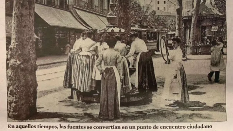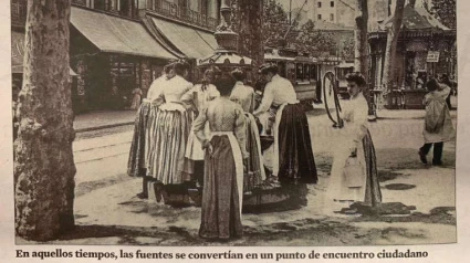 El calor debe apretar porque algunas se refugian bajo la sombra de los plátanos. Una de ellas, quizás la más joven, mira a la cámara. Lleva en la mano un cubo blanco con agua de la Fuente de Canaletas. Dice el cronista que las mujeres tenían agua en casa. Pero que se arremolinaban en torno a la fuente porque el agua de la fuente era de mejor sabor, más limpia, más fresca, mejor para la boca y para la cocina. Mejor agua la de la fuente que la que había en casa. Porque la de casa era de deposito, corría menos, saltaba menos, no sabía también.