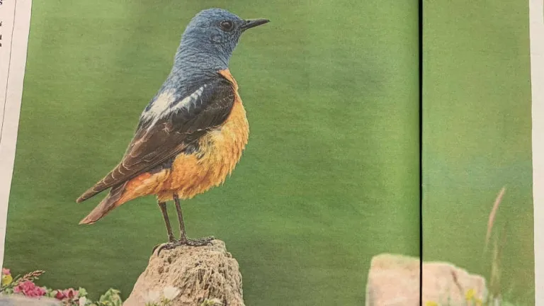 La foto que me ha llamado la atención la publica La Vanguardia. Es una foto grande de una sección que llaman Tendencias. Un retrato lleno de color. En realidad el retrato tiene mucho color pero pocos colores: un verde claro de fondo, algo d erosa, un amarillo oscuro y un azul maduro. El protagonista de la foto es un pajarico. Un roquero rojo. El rosa es de unas flores diminutas y prietas que salen de entre unas piedras gastadas de caliza. El amarillo de oro viejo es el del buche y el pecho del pájaro y el azul colbalto del lomo, del pecho y de la cabeza.