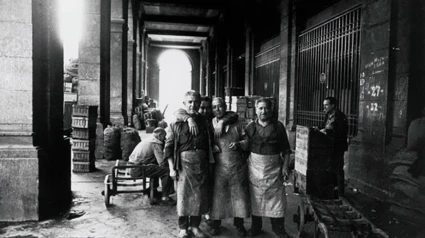 La foto que me ha llamado la atención la he visto trasteando en internet, en la obra de Xavier Miserachs, de la que se han organizado estos días unas conversaciones en el Café Gijón de Madrid. Miserachs se fue a un mercado de abastos. Y tiró allí su foto. Se fue a un mercado bajo unos grandes soportales. Soportales de piedra con arcadas altas entre las que fulge una luz intensa, quizá ya de medio día. Debajo del atrio cajas de fruta, bultos pesadas, sacos de patatas, grandes carretillas para acarrear. Hay en la plaza el olor de la huerta que ha viajado a la ciudad, el murmullo del subasteo, los gritos de los que piden paso para terminar la faena. En el centro de la foto cuatro hombres con grandes delantales. Pueden ser fruteros, carniceros, quizá pescaderos. Llevan en el rostro el madrugón, el rosario interminable de madrugones que empezó cuando eran aprendices, cuando acompañaban al padre o al tío, el rosario de días amanecidos antes que la luz. Llevan en la cara los años sin sueño, el ir y venir con el género, los años de sequía que subieron demasiado los precios, el tener muy justo para dar de comer a la familia. Llevan en la cara el trabajo, cargar, apilar, ordenar, hacer las cuentas. Llevan en la cara los dolores que aparecieron cuando dejaron de ser jóvenes. Pero no hay en sus caras ni enfado ni queja. Uno de ellos se apoya en el cuello de otros dos, como si fueran sus hermanos. Quizás lo sean, no hermanos de sangre, hermanos de madrugones, de fatigas. Hay en sus caras una alegría sobria, varonil, la de haber hecho algo juntos, la de un trabajo que deja de ser condena porque con otros al lado se siente la elemental cama-rade-ría de ser hombres, la de quien arando, cavando, vendiendo, cargando, con otros, escapa de algún modo al tiempo que se escapa silencioso.