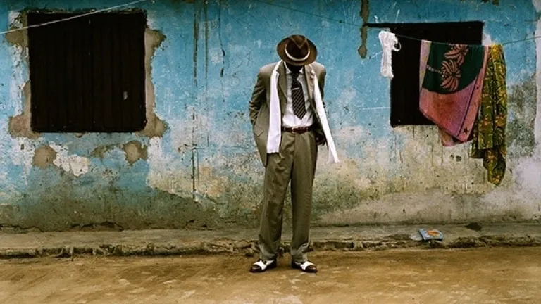 La foto que me ha llamado la atención la he visto trasteando en internet. Es de Hector Mediavilla. Está tomada en una calle muy pobre pero llena de alegría. Es un retrato de un hombre que tiene como fondo una pared azul, pared celeste, en la que se abren dos ventanas. La pared está sucia, con chorretones de cemento, con parches de enfoscado sin cubrir, sin revocar. Las ventanas no tienen ni marco ni cristales, son dos ojos negros y cuadrados. De la pared cuelga una cuerda para tender y de la cuerda pende una pieza de ropa interior y una toalla arrugada. La acera de la calle está mordida por el tiempo y por los desengaños. Y el asfalto es una tierra húmeda, un barro viscoso. En medio de ese escenario hay un hombre negro vestido con una elegancia antigua. Los zapatos de dos colores, blancos y marrones. El traje de buen paño. La corbata fijada a la camisa con un broche. Por las solapas se le desliza una ligera bufanda blanca, impoluta. Y en la cabeza un sombrero a juego. El hombre mira hacia al suelo. Seguramente busca señales, profecías, indicios. Otros se marcharon lejos en busca del destino, otros navegan de día y de noche con la ilusión de alcanzar el rayo verde. El protagonista de la foto se limita a ponerse su mejor traje cada mañana, se limita a ponerse digno para una posible visita, para una posible sorpresa, a la espera de que amanezca, por fin, un bello día.