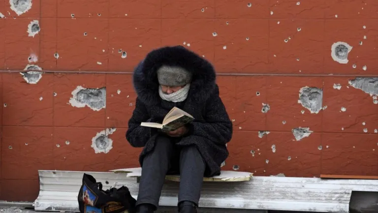 La foto que hoy me llamado la atención es la de agencia Reuters. La protagonista es una señora que está sentada sobre una persiana rota. Hace frío y la mujer se ha levantado una capucha de pelo de su chamara azul oscuro. Es como un león con una melena imposible. Debajo de la capucha la mujer lleva un gorro de lana gris. Se tapa la boca con una bufanda. Solo le queda al aire la franja de la cara entre la nariz y las cejas. La mujer ha dejado en el suelo un bolso grande y sostiene entre sus manos un libro. A pesar del frío está enfrascada, lee con toda el alma, con todo el cuerpo. De hecho, se curva sobre las páginas como sobre un plato de sopa. La pared en la que se apoya es roja. Y está llena de desconchones grandes y pequeños. En el centro de todos los desconchones hay un agujero. Es el impacto de las balas, el impacto de la metralla. La mujer pasa las páginas en el escenario de un tiroteo, donde hace unas horas, hace unos días, hace unas semanas un hombre daba caza a otro hombre. El estrépito del tiroteo, con su violencia de metal, con su soberbia destructora, se ha quedado pegado a la tapia. Por eso lee la mujer. Porque cuando la muerte te persigue, cuando está a la vuelta de la esquina, a la salida del supermercado, es difícil no pensar que eres un punto minúsculo en un universo infinito y huérfano, es difícil no pensar que eres un destello entre dos nadas, menos que la cabeza de un alfiler en la inmensidad de la historia. Por eso lee la mujer, busca en la letra impresa una historia, un poema, una idea que despierte en ella el estremecimiento que ahuyente una muerte definitiva, una sacudida que sea rotunda, que sea una prueba fiable.