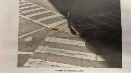 La foto que me ha llamado la atención la publica el diario El País. El fotógrafo que la firma es Oli Kellet, y ha tomado la foto en San Francisco. En el centro de la imagen aparece la protagonista. Viste falda larga y mira hacia delante con los brazos cruzados. La mujer esta sola, en frente tiene un paso de cebra, a la derecha tiene otro paso de cebra y hay un tercero a la espalda. La calzada sobre la que están pintados los pasos de cebra está gastada, usada, como la vida. La pintura blanca de los pasos de cebra también está gastada. Es una calzada, son unos pasos de cebra muy transitados, como la vida. Pero la mujer de la foto en el momento de la instantánea, repito, está sola.