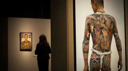 La foto que me ha llamado la atención la he visto hoy en el diario El País. Es la imagen de una exposición que hay en Barcelona. Tras una puerta, al fondo se abre una sala con ese ambiente selecto y recogido de los museos modernos: luces de baja intensidad, voces apagadas, pasos quedos sobre la moqueta, cara de concentración y de estar teniendo una experiencia incomunicable en los que se detienen en alguna de las obras de la muestra. Ya digo, eso es el fondo. Pero en primer plano hay un grito, un grito de color, un grito contra la soledad, un grito contra el tiempo. Sobre un fondo blanco, aparece la imagen de un hombre. Está de espaldas, casi desnudo, solo cubierto por un taparrabos. No es un hombre fuerte ni grande. En los gluteos tiene grabadas en negro, verde y rojo unas celosías grandes y unas flores acuáticas que se descuelgan por las piernas. El conjunto es abigarrado como una selva tropical, como un invernadero repleto. Por la espalda asciende el escorzo de un figura gruesa y fuerte, quizás un luchador de sumo. Tiene ese rostro severo con el que aparecen todos los varones en las postales japonesas: las cejas en arco pronunciado. Al llegar a los hombros más plumas, por un brazo desciendo la piel escamosa y rosa de un dragón y por el otro las sutilezas de un jardín de te asiático. Más negros, más verdes y más rojos. Solo parte de los antebrazos y de las manos están limpios de tatuajes. Lo dicho. Es difícil desnudarse y verse los cueros de uno, esos cueros solos, indigentes. Soledad, y siempre soledad. Es difícil verse en la piel una soledad de luz que busca el día. Y por eso el hombre de la foto se ha marcado con colores, con formas, con figuras, y lo ha hecho con ansia, sabiendo que toda compañía era insuficiente pero sin poder detenerse.