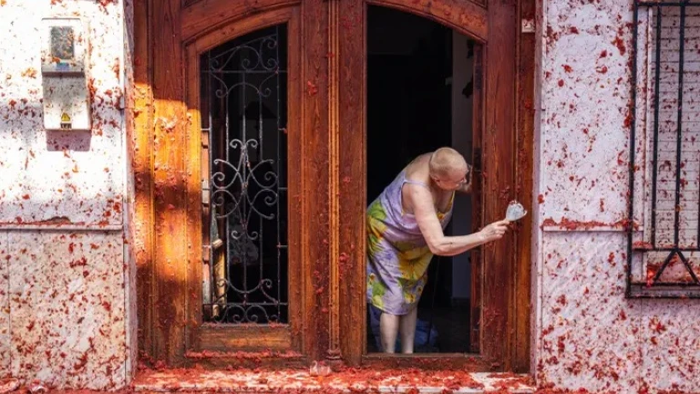 La foto que hoy me ha llamado la atención la han tomado hace algunos días en Buñol. Es el retrato de la puerta de entrada a una casa. Es una puerta noble y rubia, tallada con primor, con rejas de hierro forjado que dibujan elegantes formas. Una señora con un vestido de tirantes se afana en limpiar el marco de la puerta con una espátula. Está la señora rasca que rasca para quitar el rojo del portón. Tiene faena por delante. Han tiroteado con tomate la fachada de su casa. Los pegotes del fruto de la huerta se han quedado colgando de la madera, en el timbre, en la pared blanca, en las persianas claras, en el portero automático. Los restos carnosos se han quedado adheridos como lapas. La foto parece uno de esos cuadros de pintura moderna, los impactos escarlatas sobre el lienzo de nieve dejan rastros que parecen querer decir algo. La acera está alfombrada también de los tomates reventados que parecen pétalos de clavel. Rojo sangre en las paredes, en las calles, en el alma. Como si en Buñol se hubiera celebrado un gran sacrificio sin bestias, un gran sacrificio con las venas de la vega. Rojo sangre hasta en el último rincón para limpiarlo todo, para que la culpa oscura que se esconde furtiva entre el ventrículo izquierdo y el ventrículo derecho, entre la arteria pulmonar y las válvulas, para que esa culpa que tanto pesa quede lavada. Tomates, pichones, vacas..siempre andamos buscando algún sacrificio que nos deje sin mancha. Horas de gimnasio, dietas insufribles, días y noches de trabajos que nadie nos pide pero que nosotros ofrecemos como sacrificio para que nos dejen sin mancha. Y todo es inútil, no sirve. No hay esfuerzo que pueda conquistar la inocencia, la inocencia se regala.