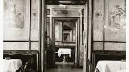 La foto que me ha llamado la atención la he visto en internet, es del fotógrafo catalán, fallecido hace unos días Ferrán Freixat. En primer plano aparece un comedor de época, con mesas pequeñas, sillas de madera bastante historiadas y las paredes decoradas con escenas de la vida cotidiana de un siglo pretérito. Los frescos le dan a la estancia un ambiente recargado.