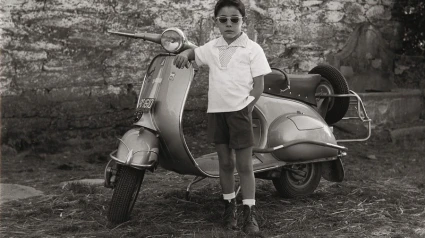 La foto que me ha llamado la atención hoy es de Virxilio Vietez, un gallego de pueblo, que hizo retratos como pocos. En el retrato que me ha cautivado Virxilio inmortaliza a un rapaz que posa ante una casa de campo, poco más que una cabaña de piedra. Estuvo en un tiempo encalada pero ahora solo le quedan rastros de un blanco comido por la humedad, la lluvia y la pereza de sus dueños. La mampostería del muro es irregular, se han utilizado piedras grandes y pequeñas para levantar la pared. En la una de las esquinas del cabañón una abrevadero un poco pretencioso para el uso que le van a dar las bestias. El centro de la foto son las gafas del rapaz, que son de sol y tienen los cristales oscuros. El niño con pantalón corto y botas de caña se apoya ligeramente en una vespa, mientras mantiene una mano en el bolsillo. En la moto, tesoro de la familia, suelen viajar el padre y la madre y el propio chiquillo. Le han dicho que se ponga delante del objetivo y ha adoptado una pose de galán italiano de los años 50. No es Gregory Peck pero está a la espera de una moza que se parezca a Audrey Hepburn a la que pasear en motocicleta los domingos. A falta de los adoquines de Roma bien pueden servir los de la era. Todo se aprende así, imitando a los mayores. El niño no puede hacer las cosas cómo las hacen sus padres, ni cómo las hacen sus actores preferidos. Pero puede intentar hacer las mismas cosas. Subir de un cierto modo el brazo, alargar el mentón, adoptar un aire diferente, meterse las manos en los bolsillos con displicencia, ocultar sus ojos bonitos y curiosos detrás de unas gafas que no necesita. Parece ridículo, pero no lo es. Así es como se aprende, no puede hacerlas como las hacen sus mayores, pero puede hacer las mismas cosas.