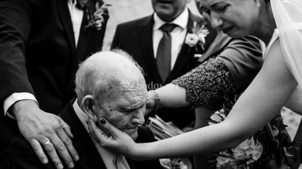 La foto que me ha llamado la atención la he visto en internet, en la web de David Copado, un fotógrafo de bodas que trabajó en Ciudad Real. Y el retrato efectivamente se ha tomado en blanco y negro en unas nupcias. El casamiento acabe de celebrarse, la novia desvelada se acerca a uno de los invitados. Es un invitado provecto, rodeado de cariño. Está en silla de ruedas porque ya no puede andar por su cuenta, lo traen y lo llevan como cuando era un niño. Sobre uno de sus hombros se posa la mano de otro invitado más joven, un invitado con pajarita en el cuello y flor en la solapa. No es el único que se acerca al anciano. Otro convidado con corbata también se arrima. Una señora le acaricia la nunca. Y la novia, la mismísima novia, con un brazo desnudo y las uñas de las manos pintadas le hace una caricia en el rostro. Recoge la novia con ternura la cara del anciano con su mano como quien recoge el más preciado fruto. Y la novia llora, llora mientras le palpa la cara al abuelo, llora con un mohín que le arruga la barbilla y la nariz, que le pliega la sien. La novia llora de emoción, la memoria plagada de momentos de la infancia, de una voz siempre sosegada, de conversaciones y de confidencias cuando la vida se volvió áspera y nadie la entendía. Llora la novia al tocar la piel de quien le ha escuchado y le ha prestado durante muchos años una mirada tranquila, una mirada compasiva para los humillados, una mirada de fuego para los poderosos abusones. El abuelo que tanto enseñó, que tanto contó ya habla poco. Toma el sol por la mañana detrás de la ventana, mira los gorriones en el alfeizar, pasa horas atento al rosal del jardín, repasar cada pétalo le lleva horas. El abuelo ya habla poco, levanta la cabeza y sonríe como si le hubieran dado un gran premio. De vez en vez dice gracias con una voz firme.