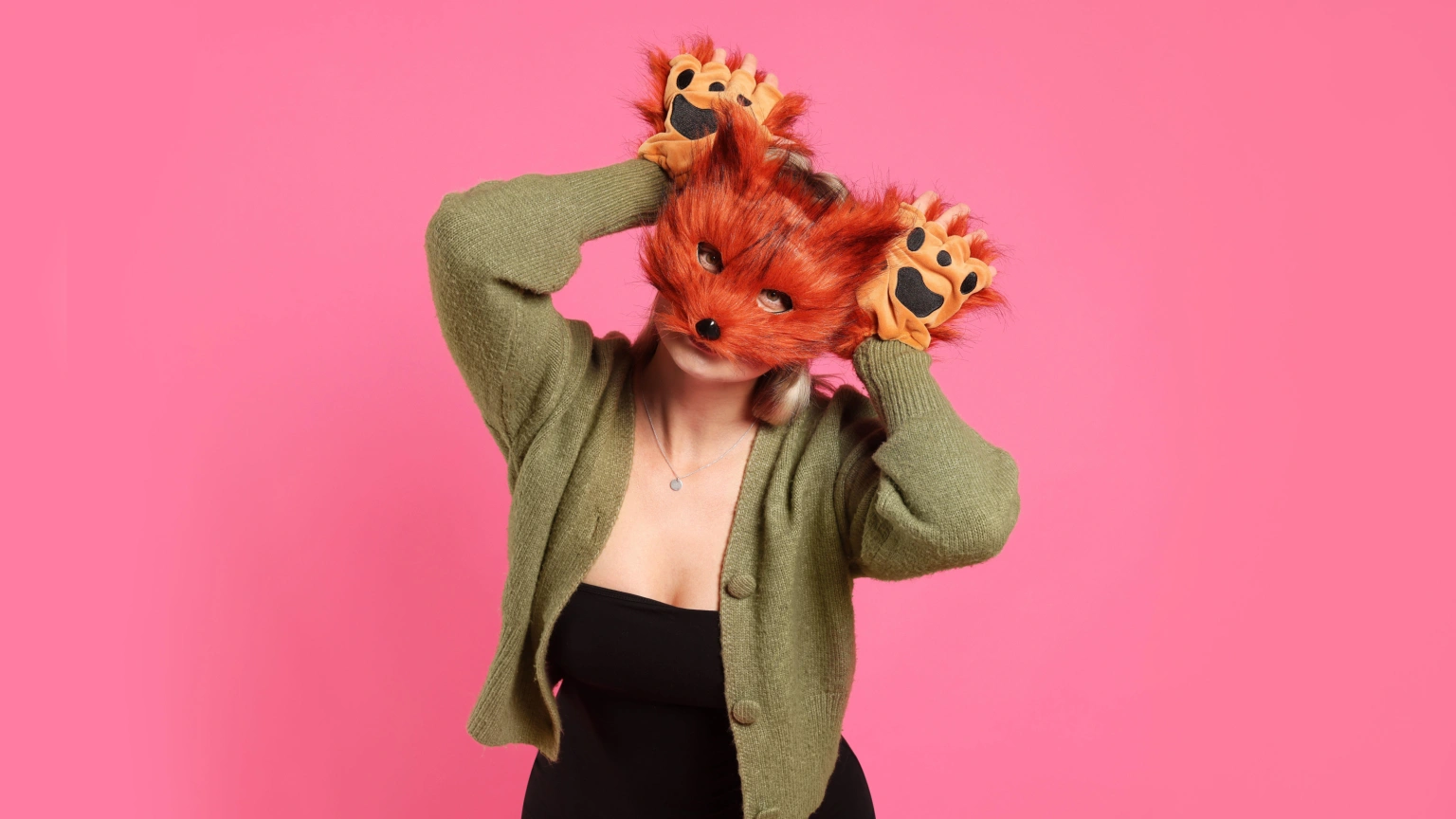 Quadrobics. Persona con máscara de gato y guantes en casa siguiendo la moda de los therians