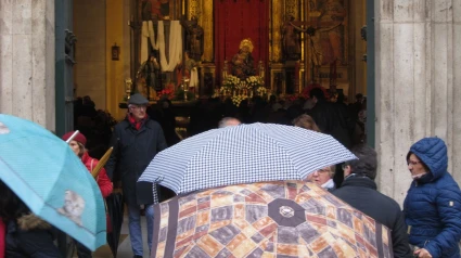 La Redención también se refugió en la Catedral, mientras que la imagen del Cristo de Santa Genoveva protagonizaba la fotografía de la tarde, al seguir su recorrido tapado con un capote a modo de chubasquero, con su virgen refugiada bajo el conocido como Arco del Postigo esperando que la lluvia amainase.