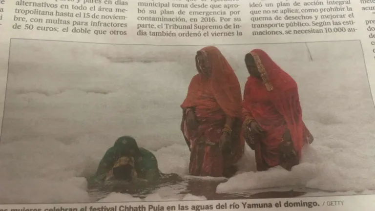 La foto que me ha llamado la atención la publica El País. Es una imagen chiquita de tres mujeres que se bañan en un río. Dos de ellas visten saris encarnados, de un rojo entre cereza y caramelo, con esa magia que tienen los colores en la India. Llevan las mujeres muchas pulseras. La tercera del grupo con sari verde, agachada, parece estar tomando los vapores. El cauce del río Yamuna, río sagrado, está cubierto de un manto blanco que parece nieve, pero las mujeres no tienen frío y la aparente nevada es en realidad una espuma muy poca sana de detergentes industriales. A las mujeres nos parece importarles, se bañan vestidas, devotas, sonrientes. Están celebrando un viejo rito védico dedicado al sol con el que se sumergen y se sumergen otra vez en un agua de la quieren salir limpias, limpias para empezar de nuevo. Y nosotros los occidentales con condescendencia y superioridad miramos la escena y pensamos que esta tres mujeres son muy primitivas, pensamos eso cuando también nosotros andamos buscando una fuentecica, un regato, un arroyo, una rivera que nos lave porque a las tres de la madugrada, a la hora de la desesperación, nos despertamos sobresaltados después de que una culpa nos haya pinchado en lo más profundo del sueño, porque esa cabronada que nos ha salido quiere silenciar la voz que nos dice que nos manchamos por completo con aquello que hicimos, porque salimos ávidos a comprar cualquier cosa que no nos hace falta porque no la queremos escuchar, buscamos una fuentecica o un regato porque nosotros muy modernos somos como las tres mujeres de la foto, estamos como ellas buscando en algún sitio agua que deje atrás las palabras mal dichas, el dolor causado, buscamos agua que nos permita empezar otra vez como si fuéramos niños recién bañados. La diferencia es que las tres mujeres de la foto lo saben, nosotros no.
