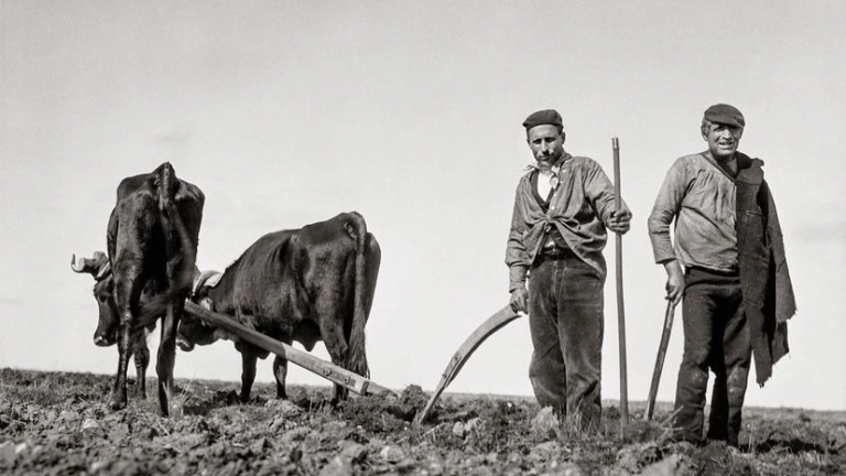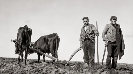 La foto que me ha llamado la atención la tomó Ruth Matilda en el Campillo, un pueblo de la Tierra del Pan, de Zamora. Ruth Matilda nació en Nebraska y se vino a tierras de Castilla hace noventa años. Era muy jovencita cuando le llamó la atención como laboreaban dos paisanos. La cámara puesta en el suelo, retrata muy cerca unos terrones aereados, volteados, removidos, preparados ya para la simiente. Unos metros más allá, el suelo todavía reposa perezoso, compacto, salpicado por pajas que quedaron del rastrojo. Dos vaquillas con más pellejo que carne y las colas muy largas descansan uncidas a un yugo de encina vieja. La reja del arado que arrastran está bien clavada. Es el mismo arado que se usó en el pueblo hace cien años, hace doscientos años, hace mil años, hace dos mil años. Le llaman romano. En las épocas buenas tiran las bestias, en los malos un vecino. Un de los labradores sostiene el tiro mientras hinca entre los terrones una vara muy recta. El rústico viste pantalones recios, quizás de pana, blusón anudado al pecho y debajo chaleco y camisa. Alrededor del cuello un pañuelo y en la cabeza una gorra que no es marinera, quizá una vieja boina puesta de aquella manera. El paisano sonríe entre socarron y divertido. Su compañero menos guasón también gasta blusa y lleva al hombro una manta vieja y mal zurcida. Echarán la sementera y luego habrá que esperar a que la helada negra no llegue demasiado pronto, a que las lluvías sean precisas y oportunas, a que el cielo sea favorable. Como todos, los labriegos, a esperar lo que no se puede alcanzar.