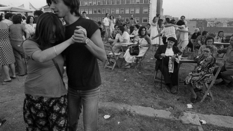 La foto de cierre que me ha llamado la atención hoy la he encontrado en el archivo de un periódico. Es la foto de una España que viví, una España de hace cuarenta años, y que ahora me parece lejanísima. En el descampado de un barrio popular, las ganas de alegría, de ver y de ser visto, estallan en una verbena. El ambiente es familiar. De fondo uno de esos bloques de pisos construidos para ganar dinero y para arruinar las ganas de vivir de los que viven bajo su techo. Sobre la hierba rala del descampado los vecinos han instalado mesas de madera y sillas de tijera. Se sientan en ellas chicos con los pantalones de campana, chicas con alpargatas de cuña, viejas con un luto de siglos, viejos de traje oscuro y boina calada. Parte del personal se arremolina en una barra en la que se sirven quintos de cerveza, vino con gaseosa, tortilla de patatas y cortezas de bolsa. Suena quizás un pasadoble, quizás algo más moderno. Un grupo discute algo muy sesudo, quizás la cuestión obrera y no se incorpora a la fiesta. Otro grupo se enlaza por los hombros para bailar. Y en primer plano un chico delgado con pantalones baqueros, una camiseta oscura y una larga melena. El muchacho rodea con un brazo la cintura de una moza y con el otro le sostiene en alto la mano. Se mueven al son de la música sin gracia y bastantes separados. Un par de abuelos los miran con una curiosidad gastada, la pareja que danza se ha convertido en un pretexto para la memoria. Los abuelos recuerdan cómo era la verbena hace cuarenta años. ¿Qué se hizo del pueblo que dejaron atrás para venirse a la capital? ¿Qué se hizo de la era, y la trilla? ¿Qué se ha hecho de aquel tiempo en el que discutíamos sobre cosas sesudas y bailábamos con mozas en las verbenas? No se ha ido, está aquí, todo ese tiempo está aquí, en el segundo que también se va.