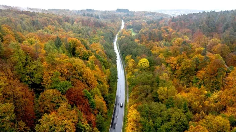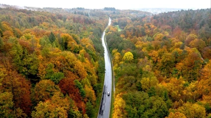 Foto área de un bosque abigarrado en Alemania. Los robles, los castaños, alguna haya, los arces, los fresnos, los tilos, todos han crecido agolpados, luchando por algo de luz, apretándose sin hacer asco una raza de la otra. El bosque mestizo de muchas resinas y de hojas variadas está atravesado por una carretera mojada por la que avanza un coche. En el coche hay alguien con la cara pegada al cristal que no sale de su asombro ante la macedonia de colores. El pájaro vuela, las estrellas brillan, el universo crece y las encinas crecen para que tú y yo las miremos, las pensamos, las sintamos. Si no estuviéramos nosotros nada tendría nombre. En el coche hay alguien con la cara pegada al cristal. Ahora pone sus ojos en un amarillo limpio como el de un limón, como el de un canario, como el de una niña rubia, inocente y franja. Después le sorprende una copa de un color trigueño, con el rubio de un niño crecido que ya es casi un mozo. Y más allá se detiene en una candela roja que se lanza hacia el cielo como una flecha, y en el oro viejo de unas hojas que ya se jubilan, y en el canela de un roble sabio, y en el caramelo que salpica el verde, y en la miel de los chopos, y en la mostaza de los más adelantados. Árboles de otoño, fantasías de una despedida con nostalgia. Arboles de otoño que no saben su nombre que no saben sin andan vestidos o desnudos, que no se saben adornados con galas de melancolía. Arboles que esperan que tú y yo les demos palabras, que tu yo nos escondamos tras ellos y nos tapemos con sus hojas.