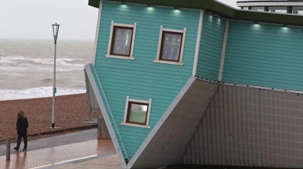 Foto de un paseo marítimo batido por la lluvia. Debajo de las olas un agua de chocolate, como si del fondo hubiera salido a flote todo lo que está sucio. Al borde del paseo marítimo una casa verde con un techo a dos aguas. En el que debía ser el primer piso dos ventanas bien guardadas por dos cortinas blancas, cortinas bordadas con hilo de Holanda. Dos ventanas gemelas que no son ya las ventanas del primer piso. La casa está del revés, La cumbrera, el pico en el que acaba el tejado, está apoyado en el suelo y forma una gran uve. La casa está del revés, la cabeza en el suelo, los pies por alto. Habrá que entrar en la casa por la ventanilla de la buhardilla y andar por el techo. La casa está del revés porque a algún arquitecto se le ha ocurrió que también las viviendas pueden estar patas arriba. No es nada nuevo a veces nos vestimos del revés, a veces tomamos una medicina que obra al revés de lo que debía obrar, a menudo andamos al revés porque andamos dejados y descuidados, a menudo hacemos las cosas mal hechas y donde debía estar la frente esta la espalda y damos el golpe no con la mano buena sino con la mano vuelta y vamos al contrario y lo que tenia que ser haz es envés y lo que debía ser cara es cruz y lo que tenía que ser marcha adelante es marcha atrás. Y vivimos en casas que se han dado la vuelta. Y el que diga que no le pasa es que no es sincero.