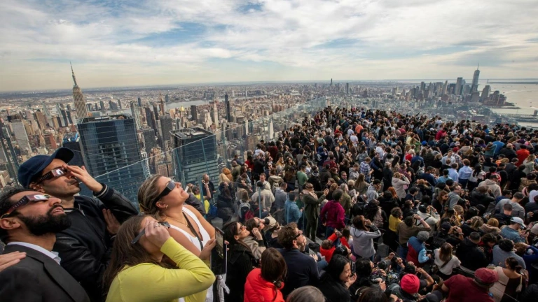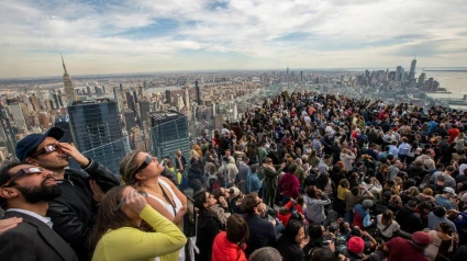 Foto de vecinos de Nueva York que miran al cielo con gafas de cartón y mucha atención para ver el prodigio del eclipse. La foto está tomada desde una terraza y la imagen tiene mucha profundidad. Unas nubes altas y ligeras se fugan hacia el horizonte y allí a lo lejos se unen sin prisa el agua y el cielo. Debajo del cielo en fuga se ve la isla de Manhattan con sus rascacielos. Todo está sembrado de grandes torres de hierro, acero y ladrillo que desde lejos parece que no costasen dinero, parecen juguetes de un niño muy grande. Una multitud de vecinos se ha congregado para ver la maravilla anunciada. Le dan la espalda a la gran ciudad como si fuera cosa de nada todo el esfuerzo, todo el trabajo que ha sido necesario para levantar tanto edificio fuerte y alto. Pero se cansa uno de mirar lo que ha construido con andamios, con fuerza de voluntad y con disciplina. Se cansa uno de lo que puede hacer cuando es rico y de lo que puede hacer cuando es pobre. Se cansa uno porque todo aburre hasta la canción mejor cantada, hasta la cara más bonita, hasta la mejor faena. Por eso están los vecinos fuera de casa, de espaldas a la ciudad, por eso han ido a la tienda de la esquina a comprarse unas gafas especiales para la ocasión. En realidad les hubieran servido sus gafas de sol de siempre, pero han querido gastarse cinco dólares en unas gafas de cartón para decirse a sí mismos que lo que que va a suceder es nuevo. El sol escondido en pleno día. Una maravilla que solo dura cinco minutos. Y en esos cinco minutos volverá la sensación que producen los grandes rascielos, todo cansa, o casi todo cansa.