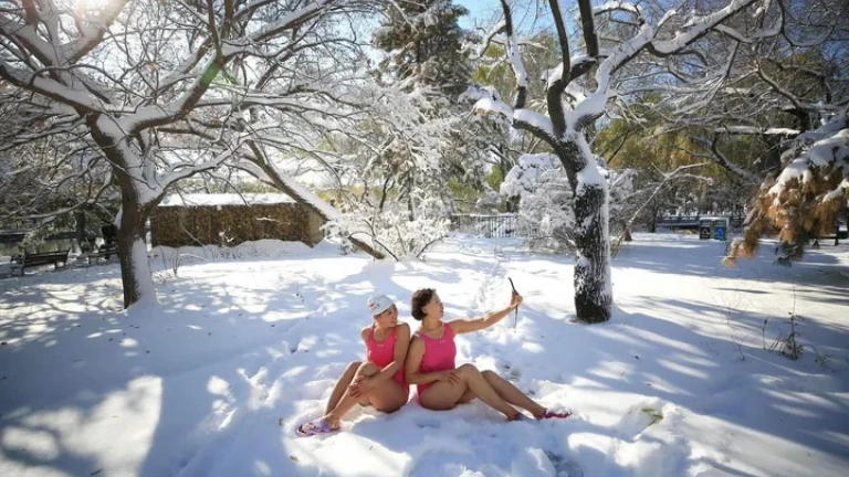 Foto de dos señoras chinas entusiasmadas, radiantes. La mañana está luminosa como si fuera una mañana de enero. El parque más conocido de la ciudad de Shenyang, al norte del país, ha amanecido nevado. El sol juguetea con las ramas desnudas de los árboles, y es atronador ese silencio que acompaña un buen nevazo. Y nadie ha pisado lo blanco y parece que el mundo está en orden. Las dos señoras han salido de casa con un traje de baño rosa, rosa chicle, debajo del abrigo. Al llegar al parque han roto el hielo de una laguna detenida por el frío y han hecho la heroicidad de sumergirse en sus aguas infernalmente gélidas. Y ahora, sentadas en el suelo, a la sombra de un tronco con los brazos muy abiertos, se hacen un selfi. A la primera señora no le se encoge ni un músculo, solo levanta el teléfono y posa con mucha intención. A la segunda si se la ve algo rígida. Se agarra las piernas y se vuelve deseosa de quedar inmortalizada. Las dos señoras disfrutan del calor que les da haber hecho lo que nadie hace, paladean la dulzura que les da el triunfo de su voluntad, el arrojo que han tenido para desafiar la helada. Se han convencido de que no era para tanto, de que lo malo ha sido la primera impresión, de que si eran capaces de aguantar los primeros minutos todo sería más fácil. Se han convencido de que el secreto es no molestar el alma con las cosas que no se pueden controlar, se han convencido de que el secreto es dejar de desear el calor, vivir, en definitiva, sin pretensiones. Pero los primeros síntomas de congelación ha empezado a aparecer.