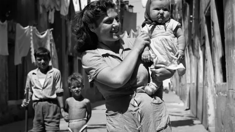 La foto de hoy es una foto de hace 75 años tomada en Venecia. La han expuesto en un festival de Venecia. El retrato está tomado en una calle estrecha, un día de verano, despejado. La calle huele a cieno, al agua detenida en los canales, a los higos no recogidos de un árbol cercano, a la hermosura oriental de los mosaicos de San Marcos y a la seda que llegó en barco. En realidad el rastro de las telas no está en el aire sino en la memoria. Como el de los judíos escapando a su gueto. La calle -ya digo- es estrecha y de un lado a otro se han tendido sogas que sirven de tendal. Cuelgan en la calle manteles, sábanas, camisas y ropa interior. La ropa tarda mucho en secarse en la ciudad hay mucha humedad. Debajo de la colada caminan dos chiquillos, uno casi en cueros, con un calzón que le cubre poco, y el otro con pantalones cortos. El de los pantalones lleva en la mano una escoba con las ramitas cortadas. Delante de los chiquillos una madre joven con un vestido camisero, un vestido pobre. A la madre, con muchos bucles en un pelo muy negro, le fulge una sonrisa sin asomo de derrota, una sonrisa de orgullo, de conformidad, sin queja alguna, una sonrisa que dice que el mundo está bien dispuesto, ordenado, una sonrisa que dice que son tantas son las gracias que pesan más que los duelos y los trabajos. La madre lleva en el brazo izquierdo un bebe, una niña rolliza. A la criatura las carnes le desbordan en las muñecas, en los codos. La criatura tiene los carillos llenos y redondos, exhiben abundancia. Pero el gesto de la criatura es de desagrado, de descontento. Cosa rara en un niño. Hay algo que le disgusta, quizás todo le disgusta, especialmente la alegría de la madre.
