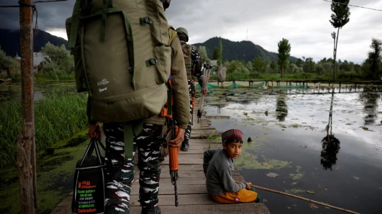 Chavales uniformados con ropa de camuflaje, manchas blancas sobre fondo negro.