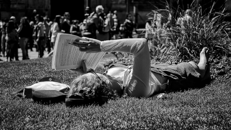 Foto en blanco y negro de Javier Calvo que expone en Ávila. La foto debe estar hecha en estas fechas, o en mayo o a principios de junio cuando el hambre de verano nos lleva a todos a hacer excesos y a coger frío. Hambre de un verano que no ha llegado. Una chica que puede ser una opositora a judicatura o una estudiante de moda ha tenido un arrebato. Estaba en casa o en la oficina, ha mirado por la ventana, y ha sentido esa profunda inquietud que provoca perderse lo mejor. Ha abierto los cristales y ha escuchado el rumor de la calle, el ir y venir sin destino de los paseantes, ha visto tórtolas y mirlos, ha imaginado lo dulce que sería la caricia del sol de primavera y ha cogido los papeles que había en la mesa y ha bajado casi a saltos las escaleras. Ha abierto con fuerza la cancela del portal y se ha subido en el parterre que hay al otro lado de la acera. Con prisa se ha descalzado para sentir en la piel las cosquillas del césped, ha tirado hacia abajo del peto vaquero que se ha puesto esta mañana y se ha tumbado junto a una mata de juncos. Las sandalias se has la puesto de almohada, se ha calado las gafas de sol. Sostiene unos apuntes o un informe en alto y para no perder la linea que lee la señala con un bolígrafo. La melena rubia le caracolea antes de llegar al suelo. Y la chica siente el calor preciso y tierno del sol en los dedos gordos de los pies y el cepillo suave de la hierba en su espalda. Y se distrae de lo que lee y piensa que le gustaría estar siempre así, estar bien, estar muy a gusto. Y mientras lo piensa se da cuenta de que el brazo se le cansa de levantar los papeles y que empieza a tener demasiado calor y que no se puede concentrar. Estar bien.