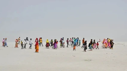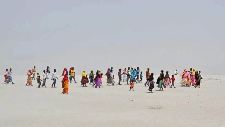 Foto de un desierto que parece una playa. La arena , de un blanco tiza, de un blanco humo de pajas. Las huellas sobre la arena van y vienen buscando el camino. Y aquí hay una mata de una de esas plantas capaces de sobrevivir a cualquier tormento y allí un trozo de madera achicharrado y más allá una duna muy tímida. El cielo también blanco, de un blanco hielo que se derrite en azules. Entre el cielo y la arena del desierto una cuerda de seis familias caminan hacia el Oeste. Caminan casi en fila. Las mujeres con saris amarillos, naranjas y rosas, morados y rojos. Y con pañuelos que les cubren de la cabeza a la cintura también de colores alegres y vivos, aunque alguno hay negro y oro. Se añaden colores a colores como si en el aire fugitivo volaran loros y papagayos. Los hombres más discretos con pantalones y dhotis que parecen faldas. Los niños a hombros, de la mano, saltando, yendo y viniendo como si no hubiera fatiga posible. Y la senda por delante, se hace camino al andar cuando el camino ya esté trazado. Toda conquista es una reconquista, toda ruptura es una forma de adueñarse de la herencia recibida. La paradoja del camino. Lo nuevo en lo viejo. Los caminantes van ligeros de equipaje, sin bolsas ni alforjas, como si pronto pudieran volver a casa. Y al volver atrás ven la senda que seguro volverán a pisar.