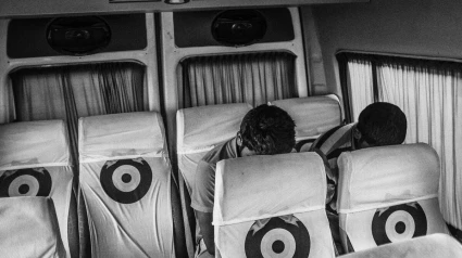 Foto de los asientos traseros de un autobús en un país donde los autobuses todavía tienen cortinas en los cristales. Los asientos con los cabezales forrados de blanco y el respaldo con el dibujo de una diana. Es la parte de atrás del autobús donde más te mareas, donde más suena el motor, donde más se notan las curvas. En la última fila dos viajeros. No han aprovechado los asientos vacíos para ir más cómodos, para intentar tumbarse siquiera de lado. Los dos viajeros se han sentado en los dos puestos que hay junto a la ventanilla. Están rendidos de cansancio porque han pasado todo el día trabajando, porque llevan varios días y varias noches en el tajo. Y desde que han subido al autobús están buscando la postura perfecta, la posición de las piernas, de los brazos y de la cabeza que les permita reposar. Primero han estado sentados muy derechos con la espalda tiesa, las rodillas dibujando un ángulo de noventa grados. Y parecía la solución, mejor así que desparramarse buscando un espacio que no hay en el autobús, mejor no intentar echarse y que se te clave en el costado uno de los brazos del asiento o que te caigas en un frenazo. Así que han inclinado la cabeza y la han hecho reposar en el cabezal del asiento que tienen delante. Y se han dormido y parecen haber encontrado la esquiva patria del sueño. Pero dentro de unos pocos minutos quizás una curva, quizás una mala pesadilla, les hará despertarse asustados sin saber durante un segundo donde están. Y luego volverá a buscar acomodo. Acomodo que palabra tan prometedora. Nunca hay un lindo acomodo para quien busca descanso o para quien busca ejercicio.