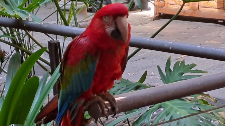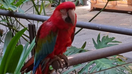 Foto de un pájaro, de un pájaro imposible, de un pájaro grande como un ocaso tenaz. Un pájaro de colores que parecen de mentira, colores como quimeras. Un pájaro con plumas que parecen un disfraz: la cabeza y el pecho de un rojo marciano, un rojo apasionado tan rojo que parece mentira, el rojo de una pasión que dura medio siglo. Estos pájaros tan enormes son además muy longevos y son prodigio porque el tiempo no le quita brillo ni intensidad al traje de carnaval que visten desde que son polluelos. El papagayo gigante ha ido de hombro en hombro y de pirata en pirata y ya se ha cansado y se ha quedado a vivir aquí en Gran Canaria en la Casa de Colón en un patio colonial de artesonado mudéjar y piedra negra, de la que escupió el volcán. El loro no habla, solo grita a veces. Y mira con ojos cansados, ojos de quien ha visto muchos naufragios. Al abuelo del abuelo del abuelo de loro con levita colorada y mangas verdes lo trajo el Almirante cuando vino de las américas. Y el abuelo del abuelo del loro entró en la corte de Castilla donde los rojos eran teñidos, y todo el mundo abrió la boca porque el loro hablaba lenguas y hablaba de las maravillas de las indias. Lo de las lenguas se fue perdiendo en la familia. Y el loro de la foto, el loro de la casa de Colón ya solo grita cuando le molestan. Pero sus plumas siguen incendiando el cielo con un ocaso imposible, con un ocaso incendiado que no se apaga nunca.