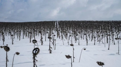 La foto que me ha llamado la atención llega de Ucrania. Cielo blanco de nubes, campo blanco de nieve. Girasoles cabizbajos y tristes.
