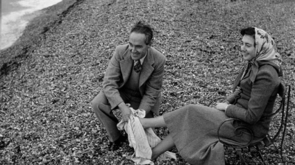 De fondo, casetas para los bañistas huérfanas y descuidas por el verano lejano. Y en primer plano una mujer joven sentada en una silla de hierro con un pañuelo en la cabeza y una chaqueta y una falda muy abrigadas. Junto a ella un hombre también joven con corbata, jersey y americana de tweed. También sonríe. Los dos miran a en el mar algo que no vemos. Los dos se ríen divertidos. Divertidos y contentos, más contentos que si se estuviesen mirando a los ojos, más contentos que cuando se ahogan en un torrente de caricias. El hombre, en cuchillas, seca los pies de la chica. Aunque hace frío ha querido mojarse los pies en la risa de las olas. Y su amigo, su enamorado, se agacha y toma con delicadeza el pie izquierdo y lo frota con delicadeza.