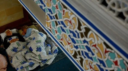 La composición es sorprendente. Buena parte está ocupada por una sanifa, una cenefa de azulejería con bordes azules que corta de forma transversal la imagen. Los azulejos dibujan laberintos geométricos como pesadillas, los dibujan en celestes, en azules de mar, en colores pastel. La zanefa decora el balcón interior de una mezquita que deja ver el piso de abajo. Ahí, abajo, descansa un matrimonio que se ha quedado sin casa.