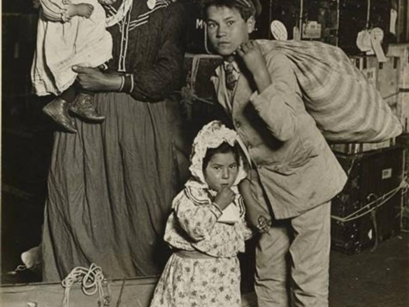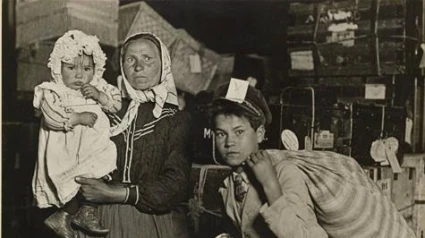 La foto que me ha llamado la atención es de la prehistoria de este arte. La hizo un estadounidense que se llamaba Lewis Hine en Ellis Iland, en Nueva York. Una madre con un pañuelo en la cabeza, una falda larga y ancha, falda de faena, una madre con la cara redonda, con ojos de susto, con manos muy trabajadas sostiene en sus brazos una niña de poco más de un año. Una niña con unas boticas gastadas, pololos, un gorro muy historiado y con su misma cara. La madre tiene a sus pies una maleta larga, grande, vieja, reforzada con dos sogas que se anudan dejando mucho cabo suelto. En esa maleta está la mitad de lo que había en la casa Delante, otra niña más crecida, con un vestido estampado y otro gorrito exagerado. Esta segunda criatura también ha sacado la nariz y los pómulos de la madre. Esta segunda criatura le coge la mano a su hermano mayor que viste ya de hombre con un trajo claro y una corbata con el nudo bien hecho. El joven no tiene miedo, en su mirada hay decisión, carga con un bolsa a rayas donde guardan la otra mitad de la casa. El viaje ha sido muy largo. Otros no quisieron zarpar aunque el tizón, la cólera de la patata se ha convertido en una maldición. La tierra parece maldita y todo lo que alumbra está muerto, incomestible. Y no hay más que hambre, no hay ni tiempo para los funerales. Pero la madre de la cara redonda, sentada en su cocina, escuchó un soplo leve, un soplo infantil y desprotegido. La vecina le dijo, cuando se lo contó, que no era nada, que se olvidara. A, la vecina, también le había parecido escuchar como un murmullo de niña pero con los dolores y con el hambre no quiso prestar atención. Era la voz debil, el soplo infantil de la niña esperanza. Por ese soplo la madre se embarcó y ahora, con ojos de susto, mira un mundo nuevo.