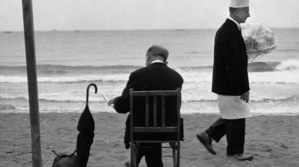 La foto que me ha llamado la atención hoy es de la Playa del Sardinero, un Sardinero en blanco y negro de Gerardo Vielba. La composición equilibradísima. A la izquierda del cuadro un poste de madera con garfios para colgar un toldo los días de sol. Junto al poste, una bonita bolsa de piel y un gran paraguas negro pinchado en la arena. El mango del paraguas y parece un pingüino o un jefe de gabinete muy circunspecto y servicial. El dueño del paraguas y de la bolsa se ha acomodado en una silla de madera plantada frente al mar. Viste con chaqueta oscura y ancha como un escribiente decimonónico. Va bien abrigado para protegerse del aliento del Cantábrico. Tiene la cabeza inclinada sobre el diario, las olas son un pretexto, un susurro casi insignificante. Junto al veraneante que lee el periódico pasa un cocinero con su gorro blanco, con su gorro alto de popelín muy almidonado. Al cocinero se le hunden las botas en la arena, debajo del traje negro le asoma un delantal largo. Lleva en su mano derecha una bandeja muy cargada quizá de emparedados de hojaldre, o de sacristanes de Liérganes o de corbatas de Unquera. La tortada y las viandas con el paseo del cocinero van recogiendo la brisa de la bahía y quedarán con cierto sabor a sal, a yodo y a grito de gaviota inoportuna. El mar llega dócil a la orilla. El mar es una excusa, una cortada. Los dos personajes de la foto no lo miran, no lo escuchan. Lo último que se les ocurre es desnudarse y darse un baño. Hay que permanecer al margen, hay que esperar a que la sal y el yodo lleguen con las viandas. Ante todo prudencia, qué necesidad, qué necesidad hay de mojarse.