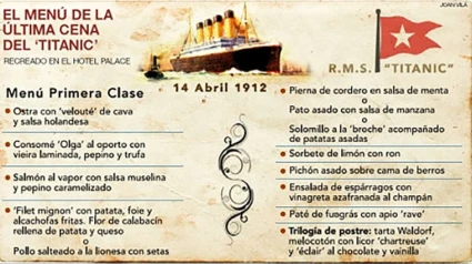 El Titanic zarpaba del puerto de Southampton el 10 abril de 1912 para llegar a Nueva York cinco días más tarde. La noche antes de llegar, el día 14 todo estaba en calma. Los pasajeros de primera disfrutaban de un maravilloso menú sin saber lo que poco despues ocurriría. El trasatlántico chocó contra un iceberg, y comenzó a hundirse. El menú estaba compuesto por nueve platos, de los cuales cinco de ellos han sido recreados nuevamente por el cocinero gallego Vicente Quiroga.